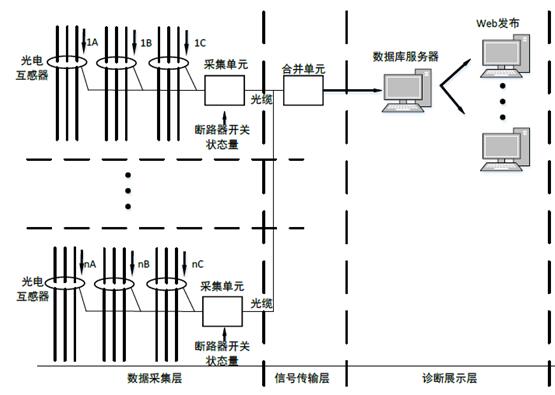 數(shù)據(jù)采集層:采集單元實(shí)時(shí)采集斷路器三相開(kāi)斷電流,電光轉(zhuǎn)換后輸出光信號(hào);